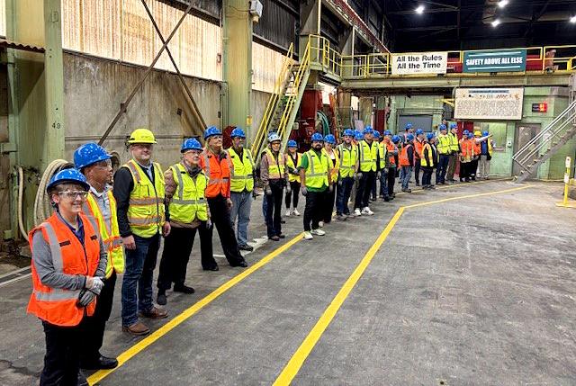 During the tour, attendees learned how the IP integrated mill turns wood chips and recycled fibers into paper rolls, a process that combines century-old science with modern efficiency. The operation is nearly 100% self-contained, featuring a “powerhouse” that generates its own steam and electricity, and a closed-loop chemical recovery cycle that minimizes waste.