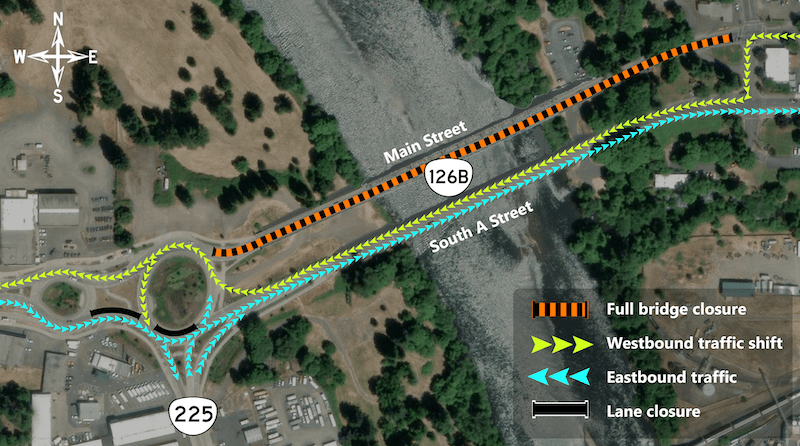 Local freight and passenger vehicles can use South A Street Bridge or detour around the work zone using Pioneer Parkway and OR 126. Larger freight and oversized vehicles can use OR 126 / Bob Straub Parkway to get around the Main Street Bridge closure.
