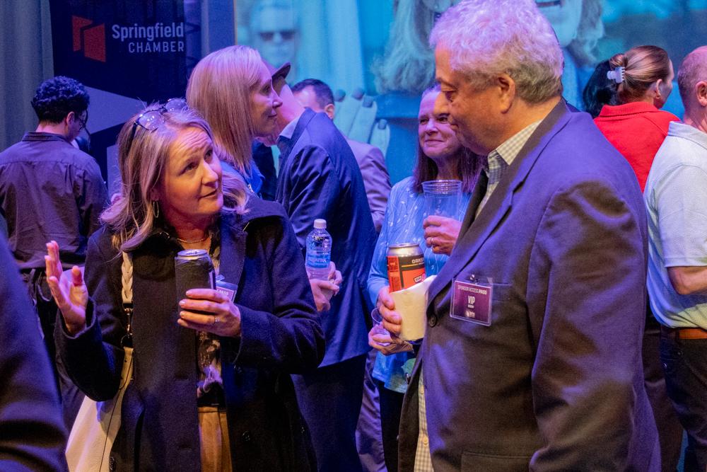 The night began with an hour of professional networking on the stage of the Wildish, where 275 attendees met up with colleagues and friends, solidifying relationships and creating new ones, while a backdrop slide show of the Springfield Chamber’s “year in review” looped beneath Chamber-branded lighting of purple and warm red.